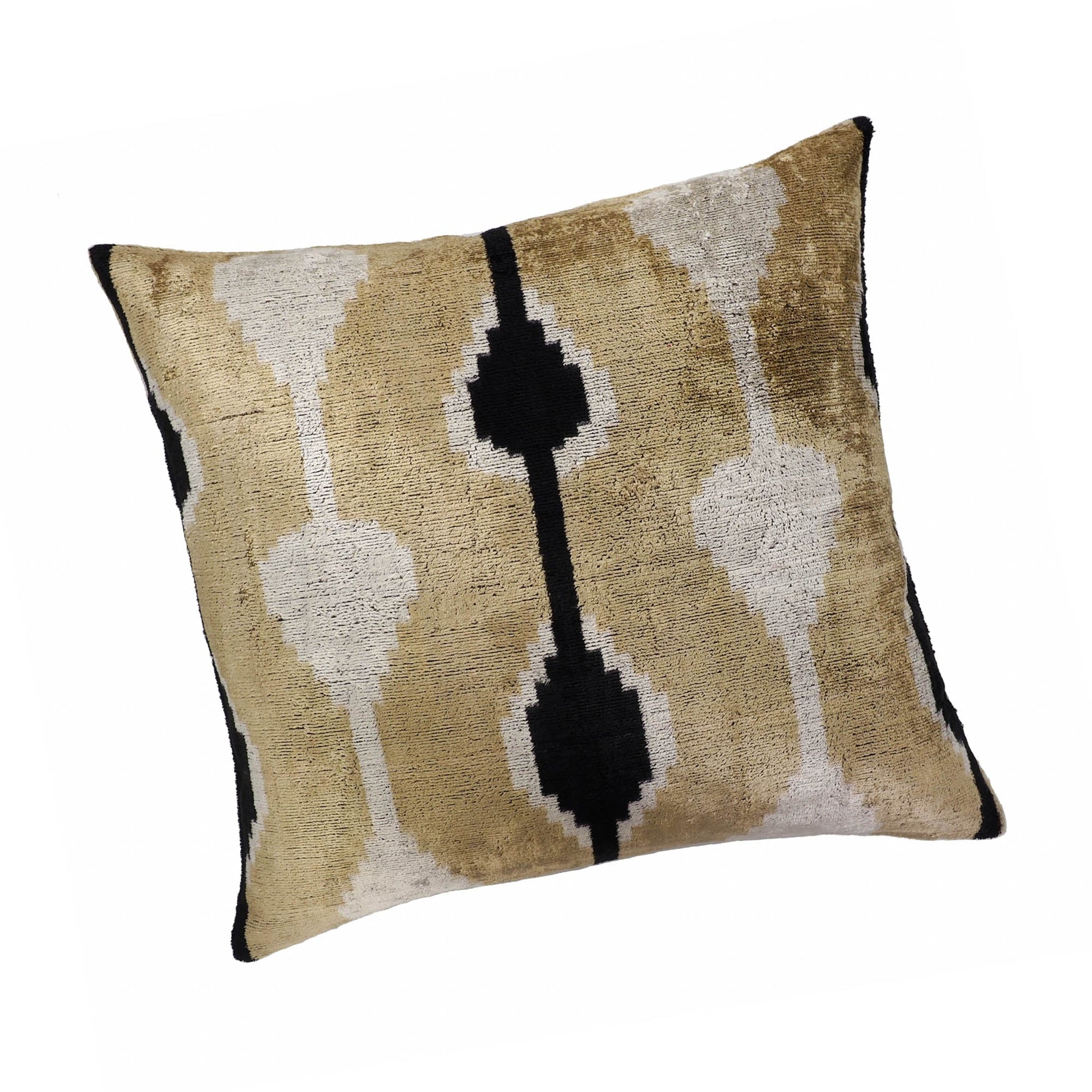 Unveil your space with the timeless elegance of the Kisses Silk Velvet Ikat Throw Pillow Cover. The neutral tones of beige, black, and ivory blend effortlessly with modern or classic interiors, while the bold geometric pattern adds a chic, sophisticated touch.